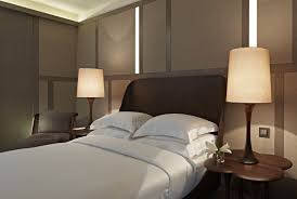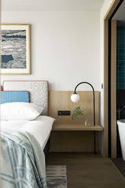 For a zen like hotel style bedroom opt for a backdrop of white walls and stripped white floorboards. Keep furniture chic in a hotel style bedroom. Headboard with integrated lighting for hotel rooms.