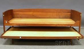 Modern twin bed with trundle. Sleeping surfaces are slatted. With its smooth and sturdy wheels the trundle easily pulls out from under the bed and holds our comfortable foam mattress. The tapered legs and natural wood finish give this bed and trundle some mid century modern vibes that ll look great in your.